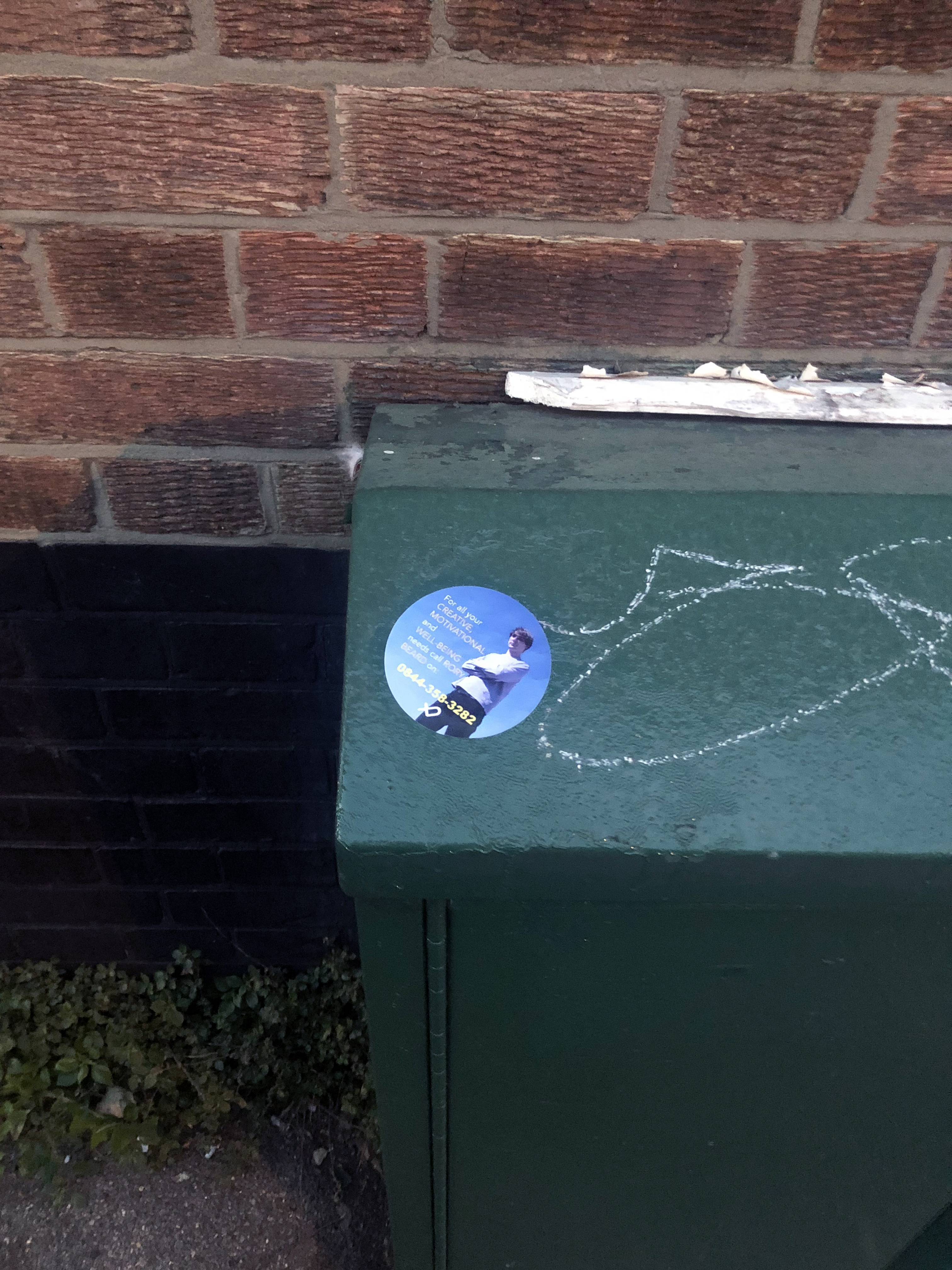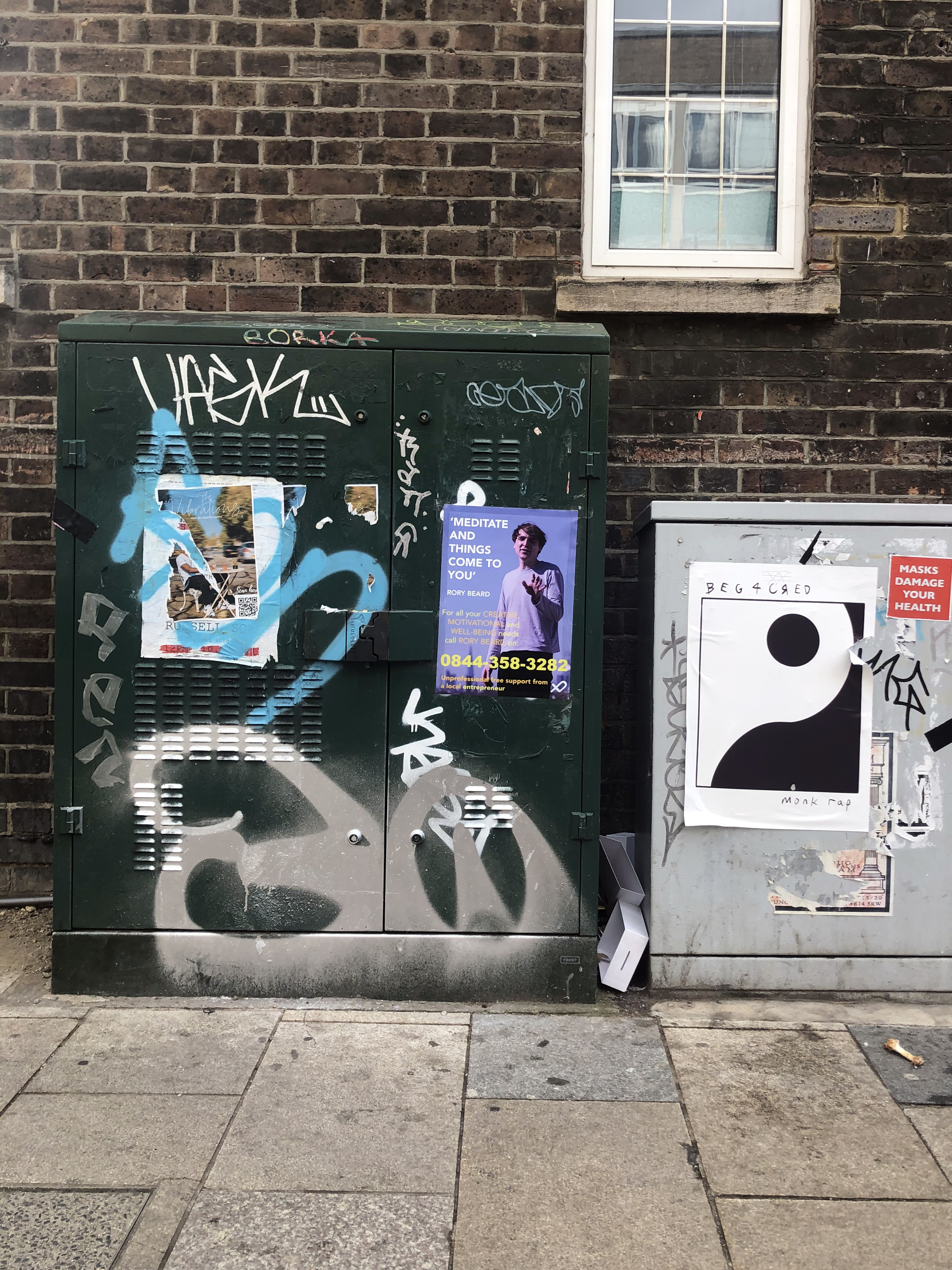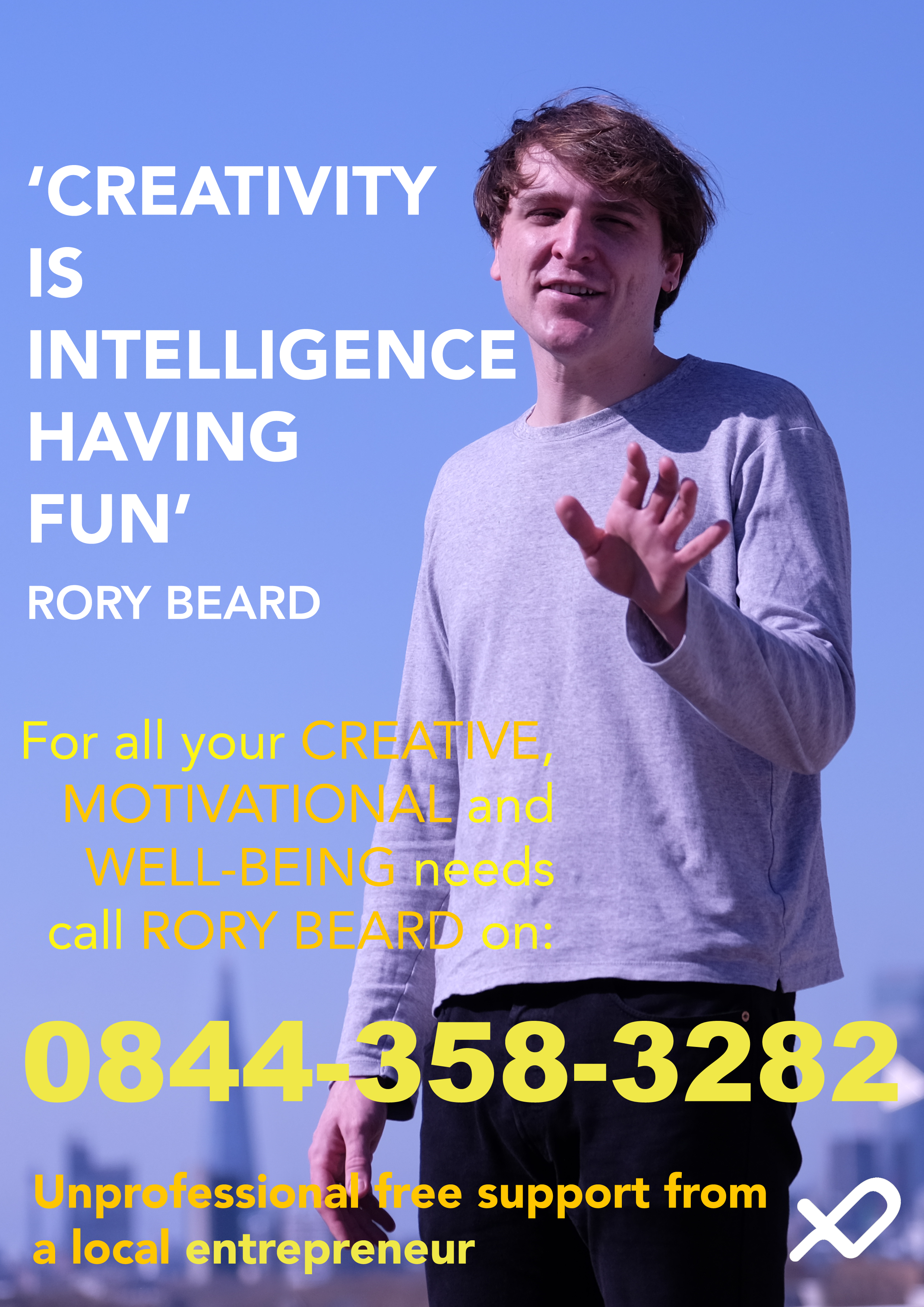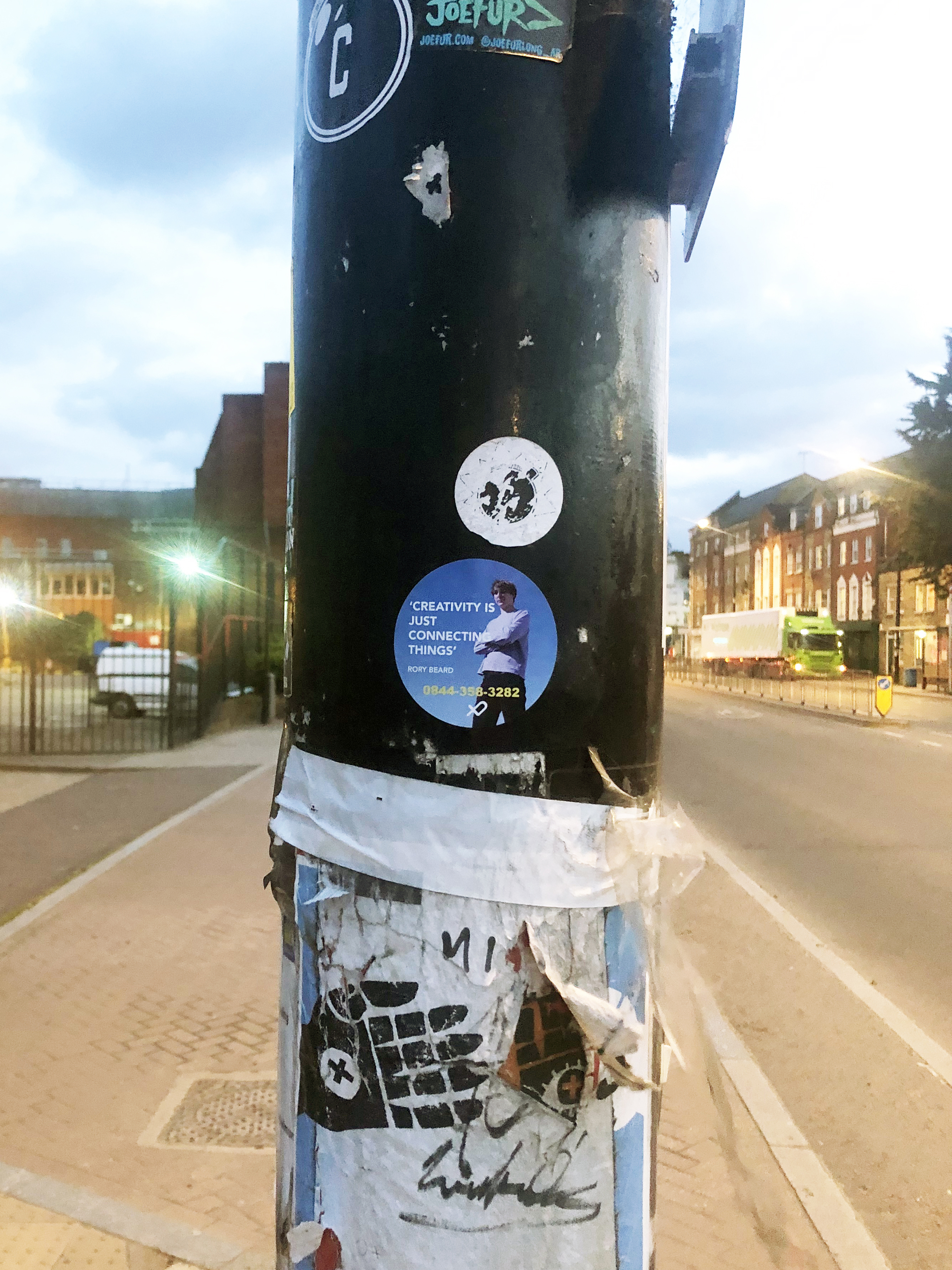 As part of a group show across various windows around Deptford I offered free unprofessional well-being, motivational and creative advice. Inside the Job Centre, a drinking establishment, I also had a CCTV running on loop of me working in the studio, this played 24-hours and could be seen through the windows at any time of day. I put up posters and stickers all across Deptford. When I had finished giving advice, I finished the session by asking about the quality of my own advice, and how it could have been delivered better.